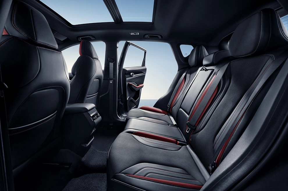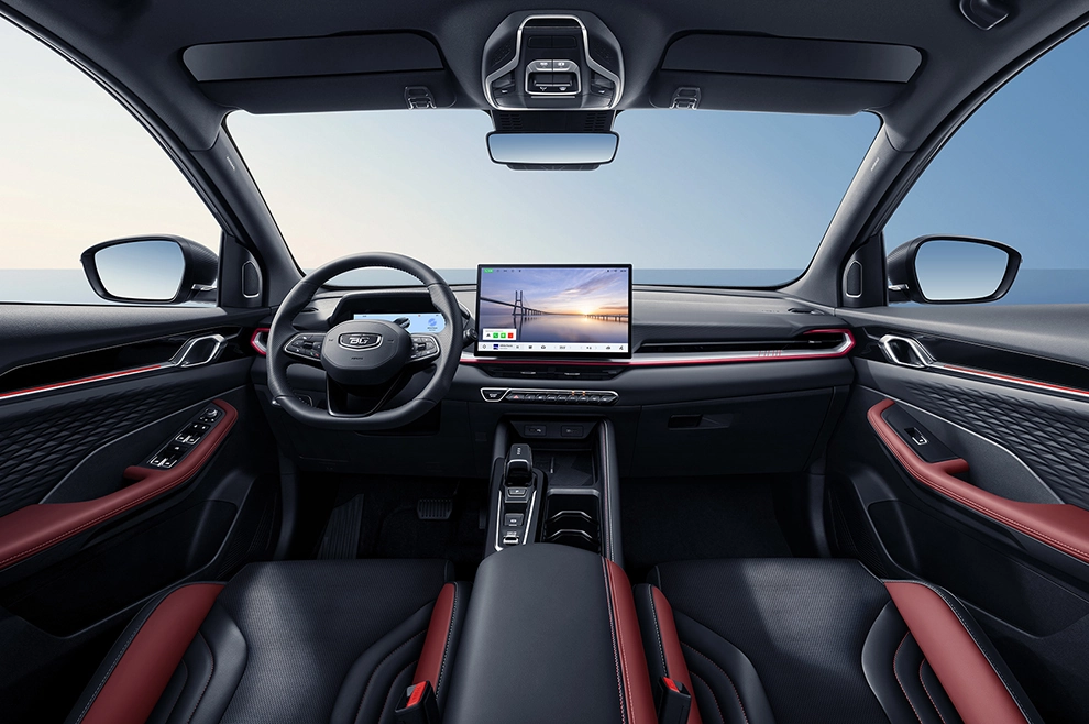 Интерьер Belgee X50+ отличается выверенной эргономикой и высоким качеством отделочных материалов, предлагая дополнительные преимущества в оформлении и функциональности. В комплектациях Актив/Active и Стиль/Style кроссовер предусматривает отделку салона и сидений экокожей черного цвета с контрастной красной прострочкой, тогда как максимальное исполнение Престиж/Prestige отличает комбинированная отделка экокожей черного и красного цветов.